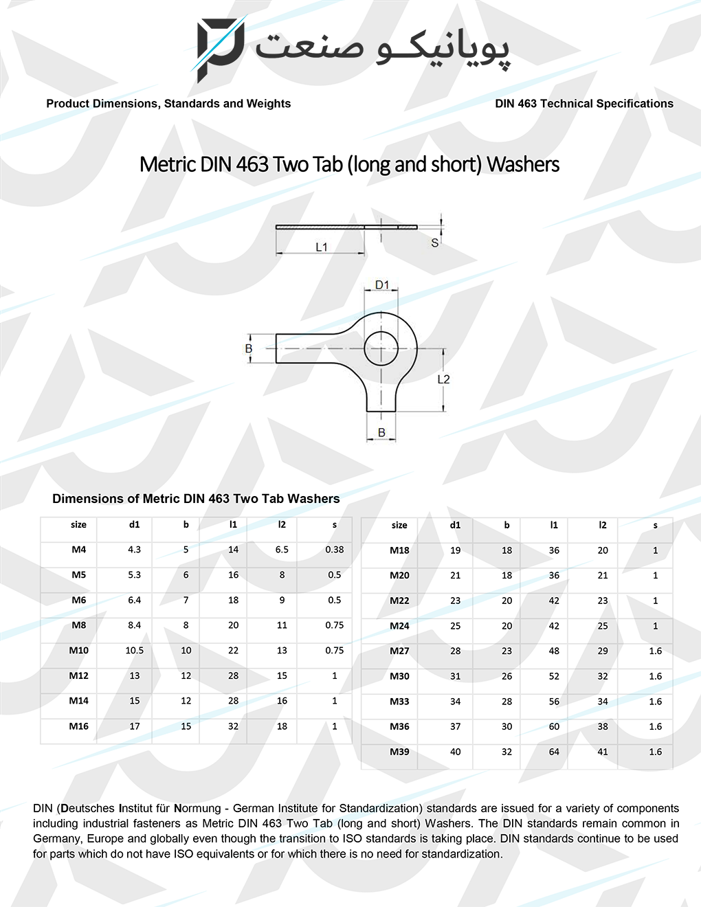 تب واشر دو زبانه (واشر دم دار) (Tab Washer) یک نوع واشر با عملکرد قفل کنندگی می باشند که پس از قرارگیری در جای خود، مانع از هرگونه حرکت چرخشی مهره میشود.این واشر با متریال استنلس استیل و آهن در گرید ها و پوششهای متنوع، در انواع سایزها و با استانداردهای روسی و اروپایی در مجموعه پویانیکو صنعت تولید می گردند.